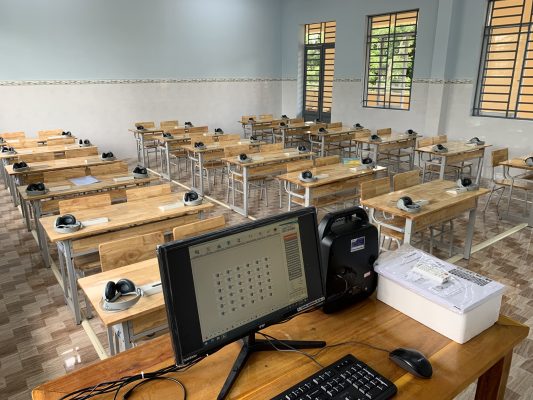 Phòng lab được thiết kế để sử dụng cho các kỳ thi trắc nghiệm, giúp đánh giá chính xác trình độ và tiến bộ của học sinh. Ngoài ra, các thiết bị và phần mềm trong phòng lab hỗ trợ hiệu quả việc luyện tập các kỹ năng nghe và nói, giúp học sinh cải thiện khả năng phát âm và giao tiếp ngoại ngữ.