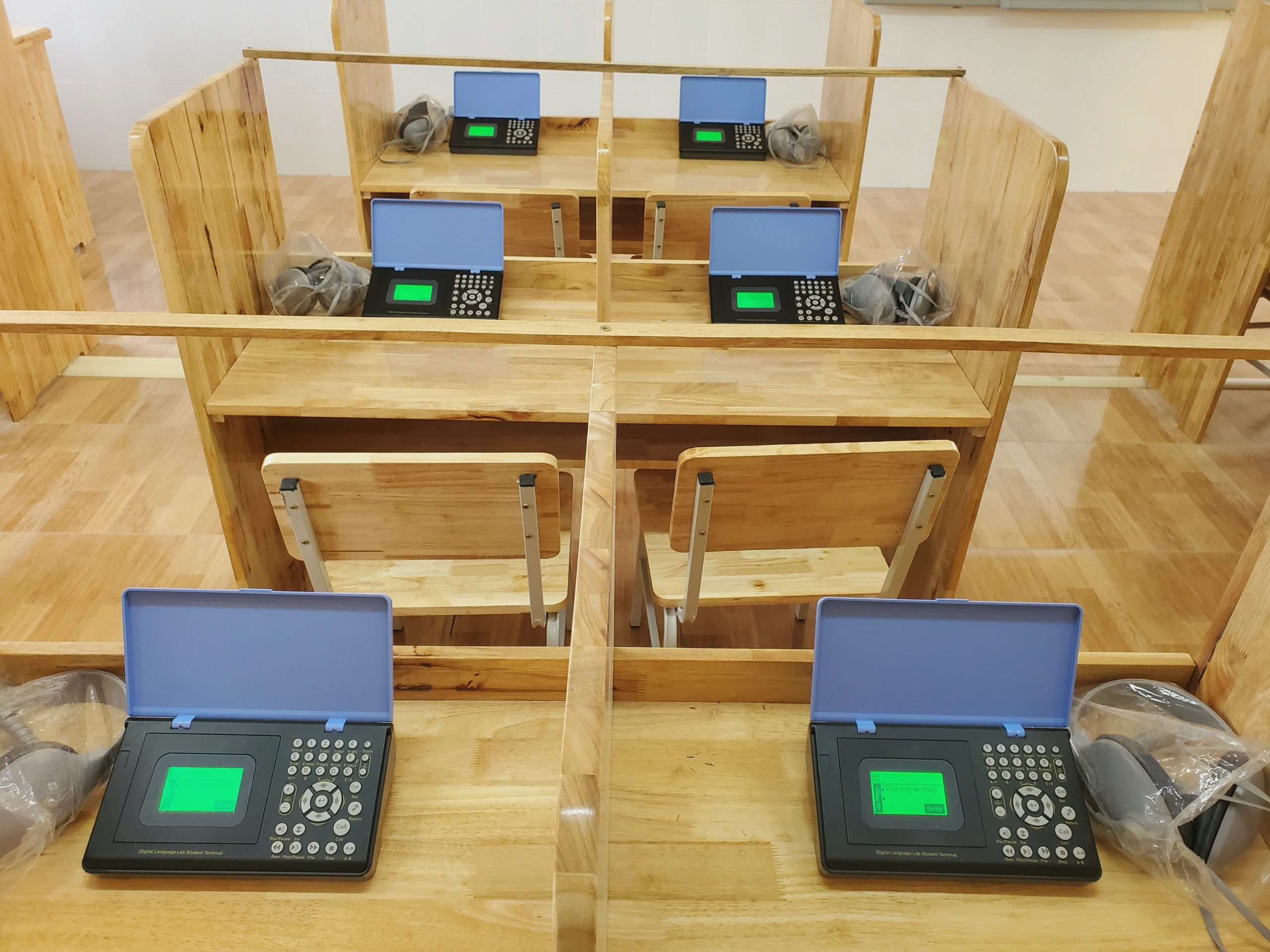 Hệ thống tai nghe: Được trang bị cho từng học sinh, hệ thống tai nghe giúp cải thiện khả năng nghe và phát âm, đồng thời tạo không gian học tập riêng tư và tập trung.