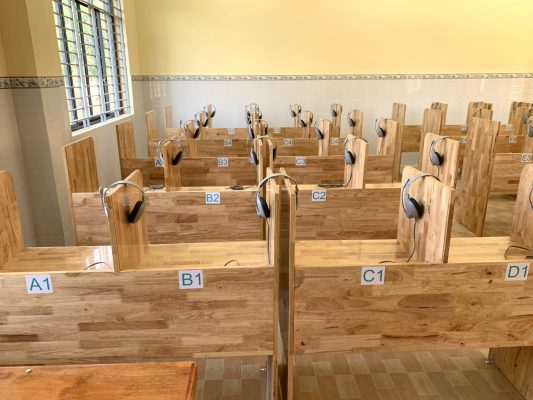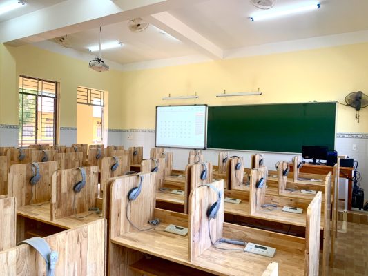 Phòng lab được trang bị hệ thống âm thanh và thiết bị ghi âm, giúp học sinh có thể luyện tập phát âm và nghe hiểu một cách hiệu quả. Các máy ghi âm và tai nghe chất lượng cao cho phép học sinh tự tin hơn trong việc luyện tập và cải thiện kỹ năng nghe nói.
