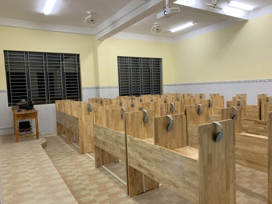 Phòng lab được thiết kế với không gian rộng rãi và bố trí hợp lý, tạo điều kiện thuận lợi cho học sinh trong quá trình học tập và luyện tập. Bàn ghế được sắp xếp khoa học, cùng với hệ thống cách âm tốt, giúp tạo ra một môi trường học tập yên tĩnh và hiệu quả.