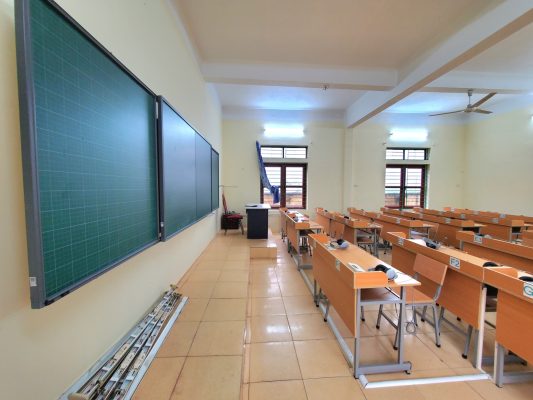 Bảng trượt ngang 2 lớp cũng được lắp đặt trong phòng lab, sử dụng kết hợp với màn hình 75 inch để tăng cường hiệu quả giảng dạy. Bảng trượt này giúp giáo viên dễ dàng chuyển đổi giữa các nội dung giảng dạy, tạo điều kiện thuận lợi cho việc ghi chú và minh họa bài học.